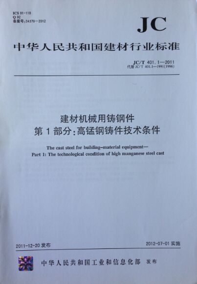 建材機械用鑄鋼件 1:高錳鋼鑄件技術條件JC/T401.1-2011代替JC/T401.1-1991 售價:15.30