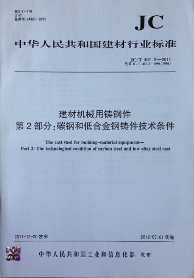 建材機械用鑄鋼件 2:碳鋼和低合金鋼鑄件技術條件JC/T401.2-2011代替JC/T401.2-1991(1996) 售價:16.15